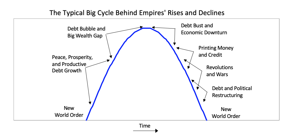 レイ・ダリオが500年の歴史を調べたところ、国の覇権にはビッグサイクルがあり、いつも同じパターンで覇権が終焉していることに気付きました。